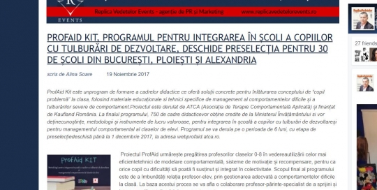 ProfAid Kit este unprogram de formare a cadrelor didactice ce oferă soluții concrete pentru înlăturarea conceptului de “copil problemă” la clasa, folosind materiale educaționale si tehnici specifice de management al comportamentelor dificile și a tulburărilor severe de comportament.Proiectul este derulat de AUTISM VOICE și finanțat de Kaufland România. La finalul programului, 750 de cadre didacticevor [...]
