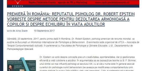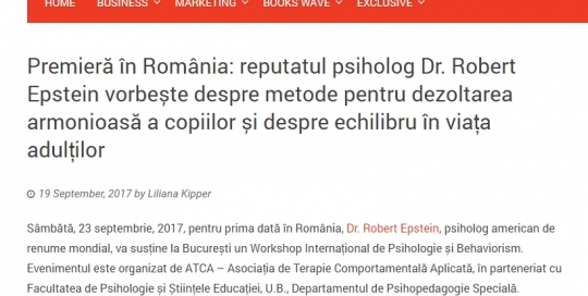 În data de 23 septembrie 2017, în București are loc, în premieră, un Workshop Internațional de Psihologie și Behaviorism susținut de cunoscutul psiholog american, Robert Epstein. Evenimentul este organizat de Autism Voice, în parteneriat cu Facultatea de Psihologie și Științele Educației, U.B., Departamentul de Psihopedagogie Specială, informează un comunicat de presă. Citeste continuarea pe Feedler.ro.