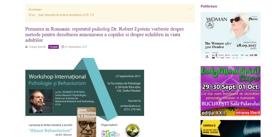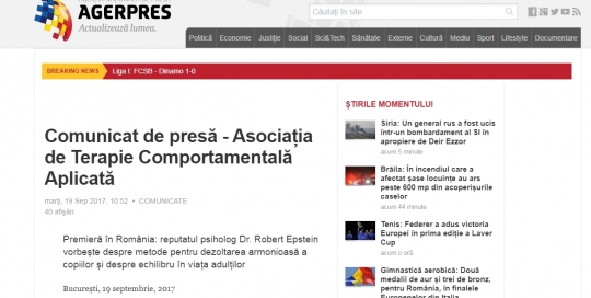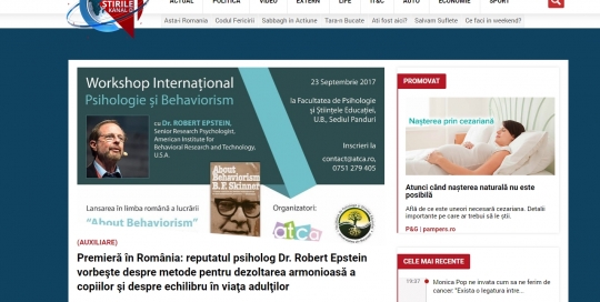 Sâmbătă, 23 septembrie, 2017, pentru prima dată în România, Dr. Robert Epstein, psiholog american de renume mondial, va susţine la Bucureşti un Workshop Internaţional de Psihologie şi Behaviorism. Evenimentul este organizat de Asociaţia de Terapie Comportamentală Aplicată, în parteneriat cu Facultatea de Psihologie şi Ştiinţele Educaţiei, U.B., Departamentul de Psihopedagogie Specială. Citeste continuarea pe StirileKanald.ro.
