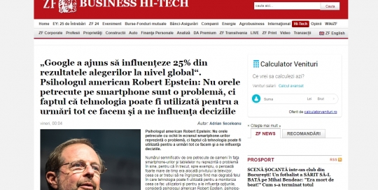 „Google a ajuns să influenţeze 25% din rezultatele alegerilor la nivel global“. Psihologul american Robert Epstein: Nu orele petrecute pe smartphone sunt o problemă, ci faptul că tehnologia poate fi utilizată pentru a urmări tot ce facem şi a ne influenţa deciziile