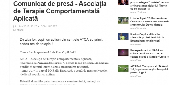 De ziua lor, copiii cu autism din centrele AUTISM VOICE au primit cadou ore de terapie ! Cum a fost la spectacolul de Ziua Copilului ? ATCA— Autism Voice, împreună cu Primăria Sectorului 3, actrita Ioana Chelaru, Magicianul Verdini și actorul Eugen Cozma au organizat miercuri, 31 mai 2017 în parcul I.O.R din București, o [...]