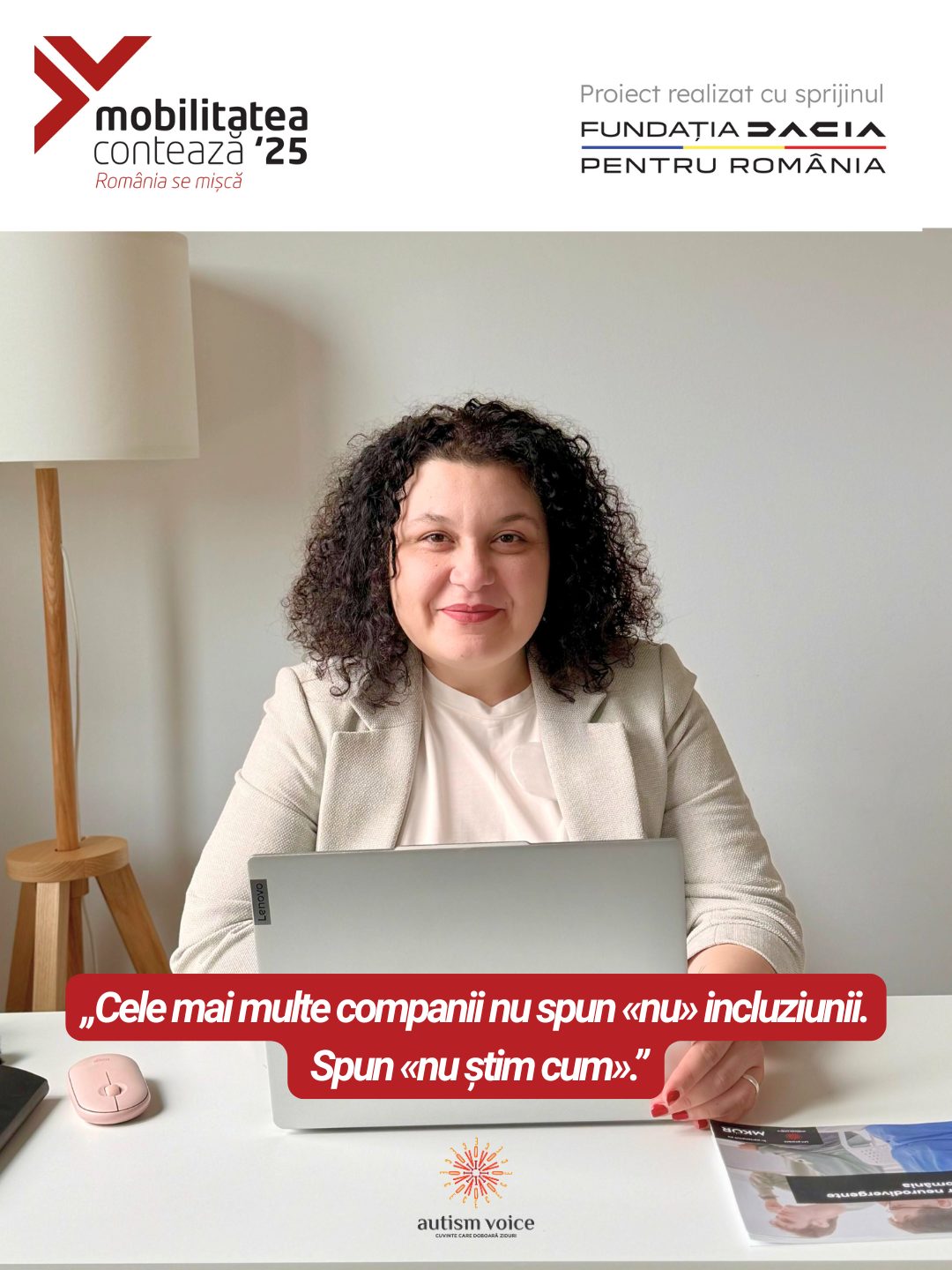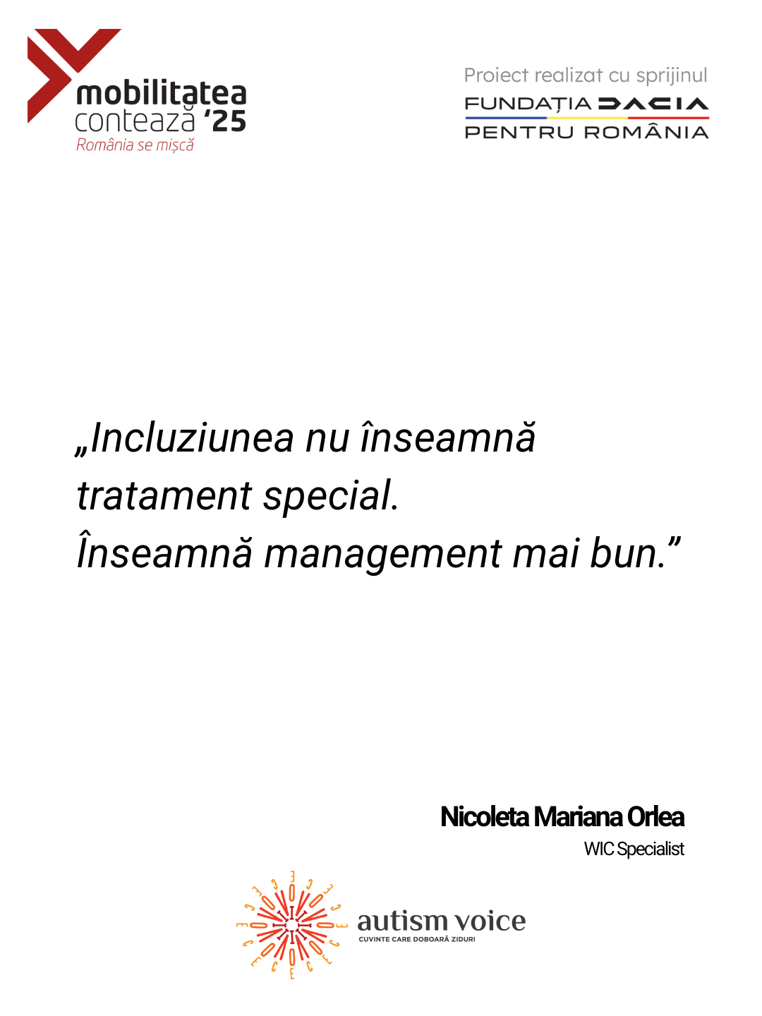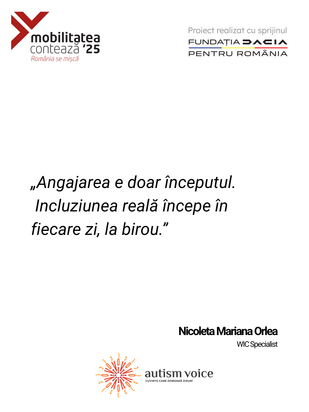În acest mini-interviu, Nicoleta Mariana Orlea, WIC Specialist, vorbește despre fricile reale din spatele incluziunii, despre cum poate fi tradusă neurodiversitatea în decizii de business și despre pașii concreți care fac diferența dintre intenție și incluziune reală, în cadrul proiectului Work Aid Kit, dezvoltat împreună cu Fundația Dacia pentru România.